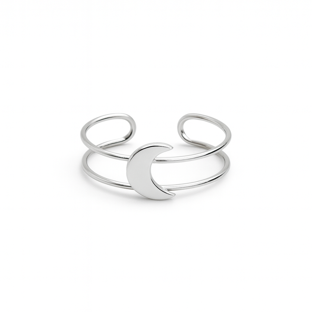 Ear cuff de plata 925 con delicado diseño de luna creciente y doble aro, ideal para darle un toque mÃstico y moderno a tu look sin necesidad de perforación. Su estructura abierta permite ajustarlo suavemente al cartÃlago, entregando un calce cómodo y seguro.