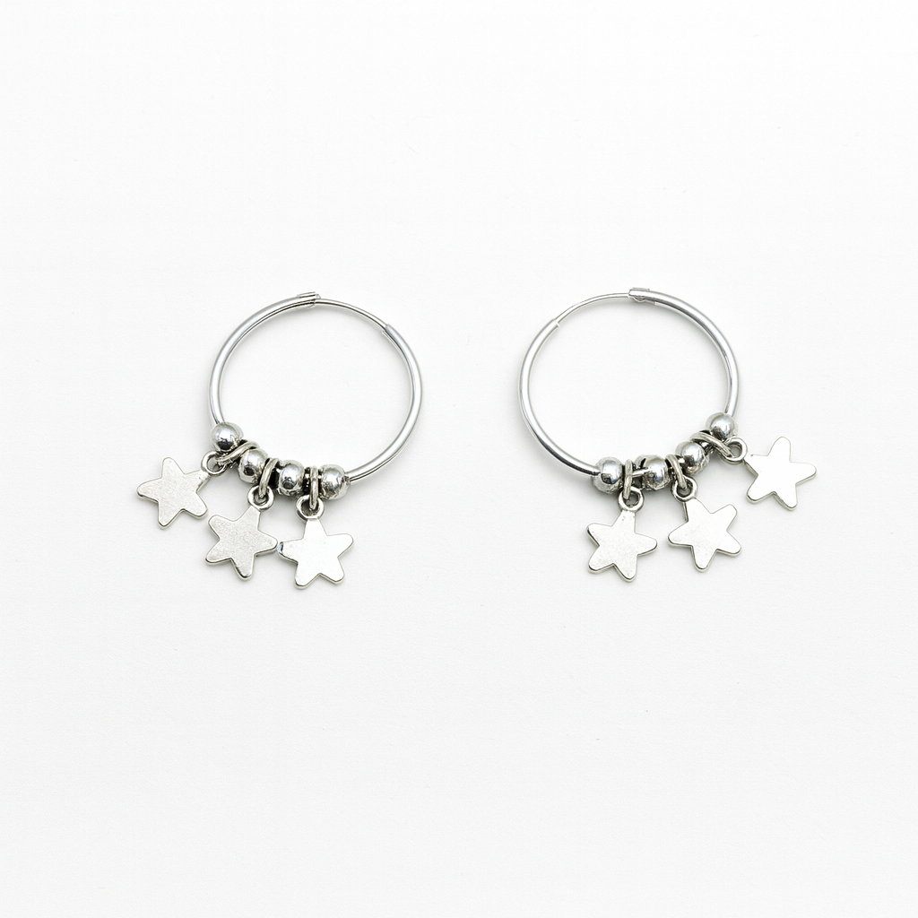Argollas de plata 925 con delicados colgantes de estrellas que aportan movimiento y un brillo sutil. Un diseño juvenil y versátil, perfecto para usar a diario o combinar con otros aros para un look más creativo.