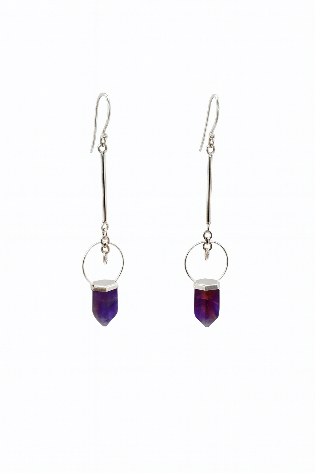 Aros colgantes con piedra amatista natural, conocidos por aportar calma, protección y claridad mental. Su diseño delicado y alargado estiliza el rostro, entregando un toque elegante con energía suave.