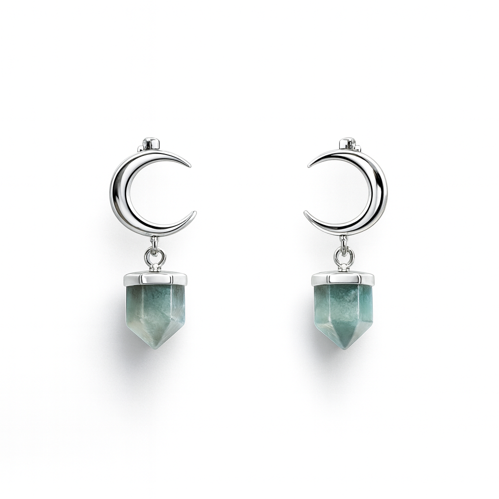 Aros con diseño de media luna y piedra verde natural en forma de punta, una combinación que simboliza renovación, equilibrio y conexión con la energía lunar. Un modelo delicado con un toque místico, ideal para quienes aman las joyas con intención.