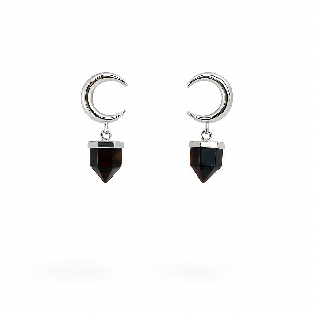Aros con diseño de media luna y piedra ónix natural en forma de punta, símbolo de protección, fuerza y estabilidad. Un modelo elegante con un aire místico, ideal para quienes buscan joyas con carácter y presencia.