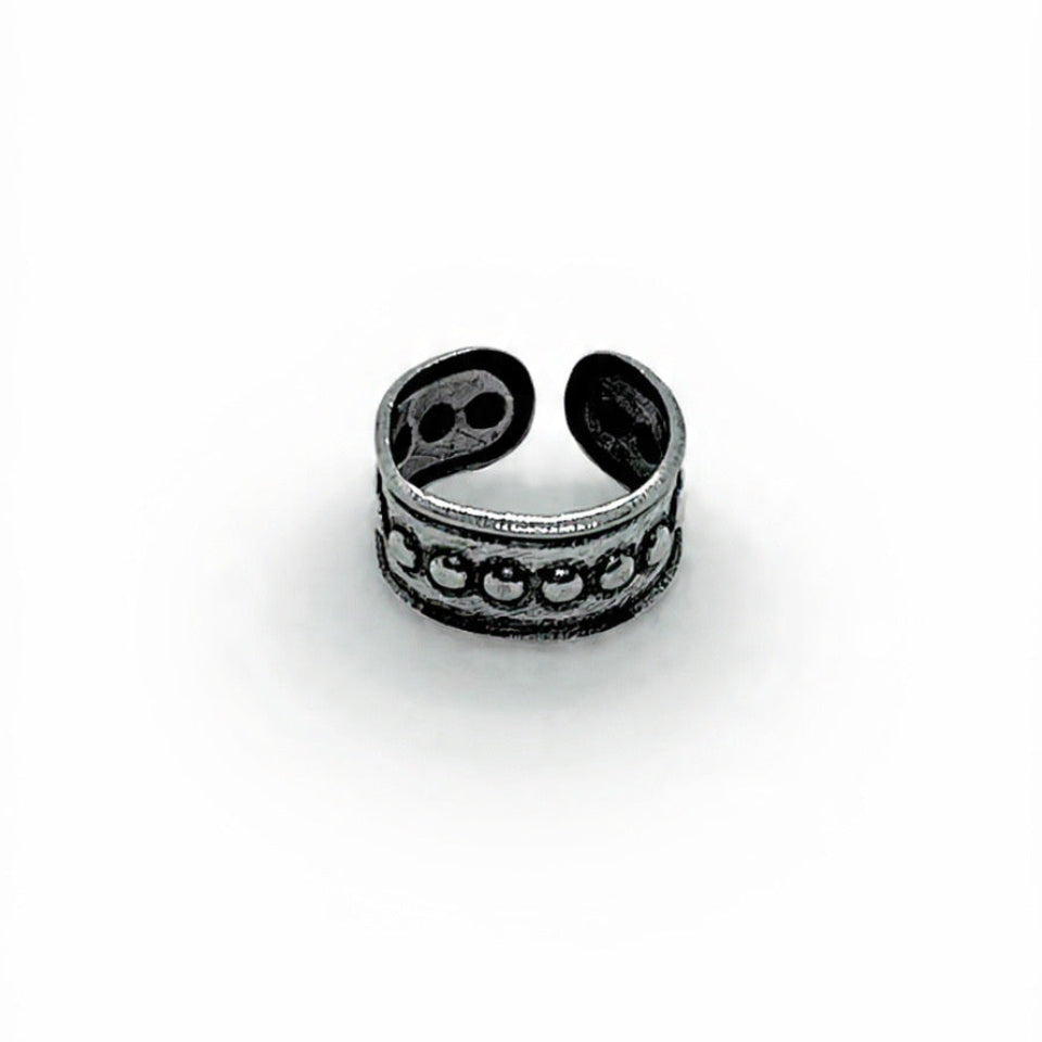 Ear cuff de estilo bohemio con delicado diseño de círculos en relieve y acabado envejecido que resalta cada detalle. Una pieza simple pero con carácter, perfecta para darle un toque diferente a tu look sin necesidad de perforación.
